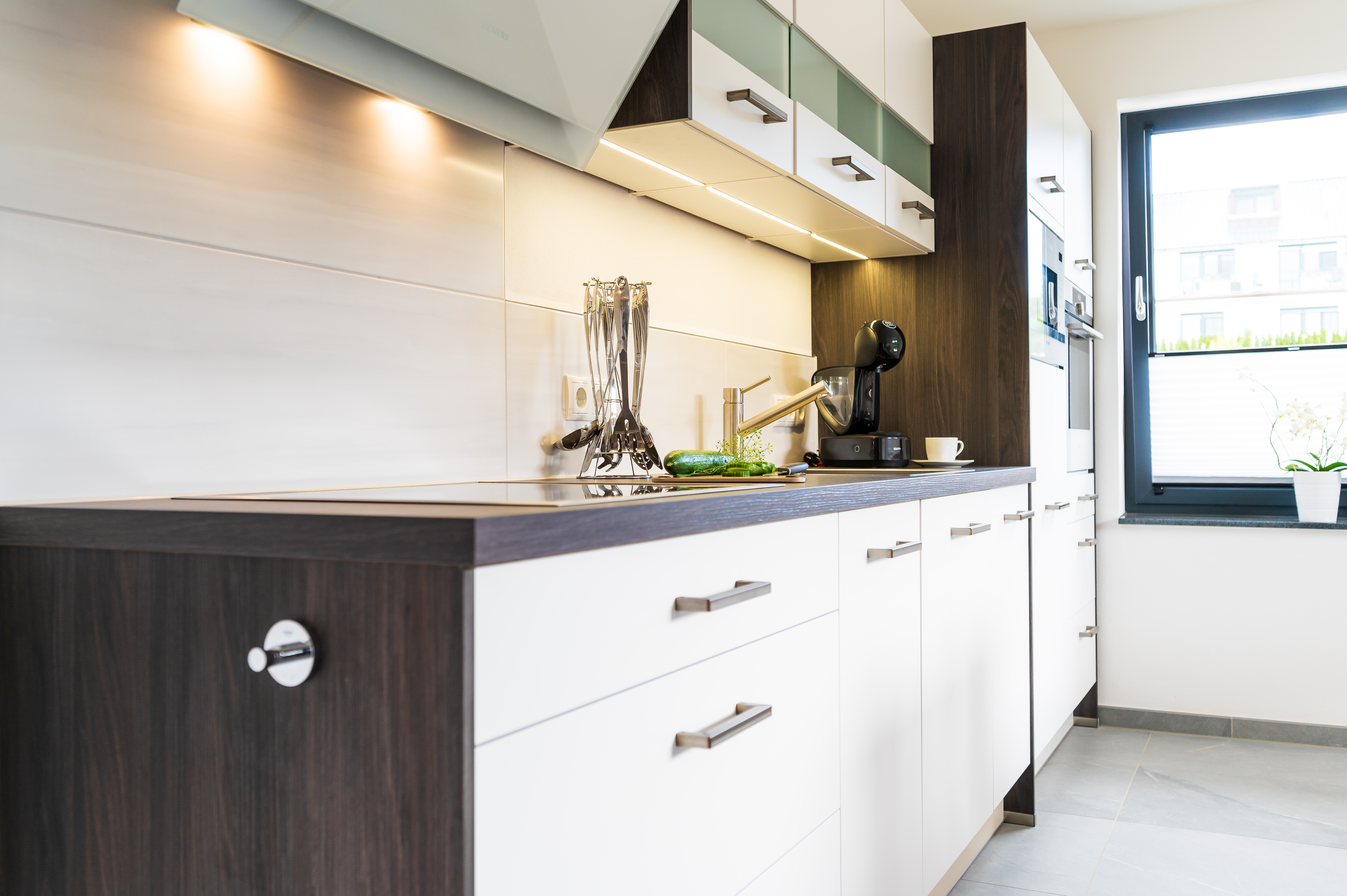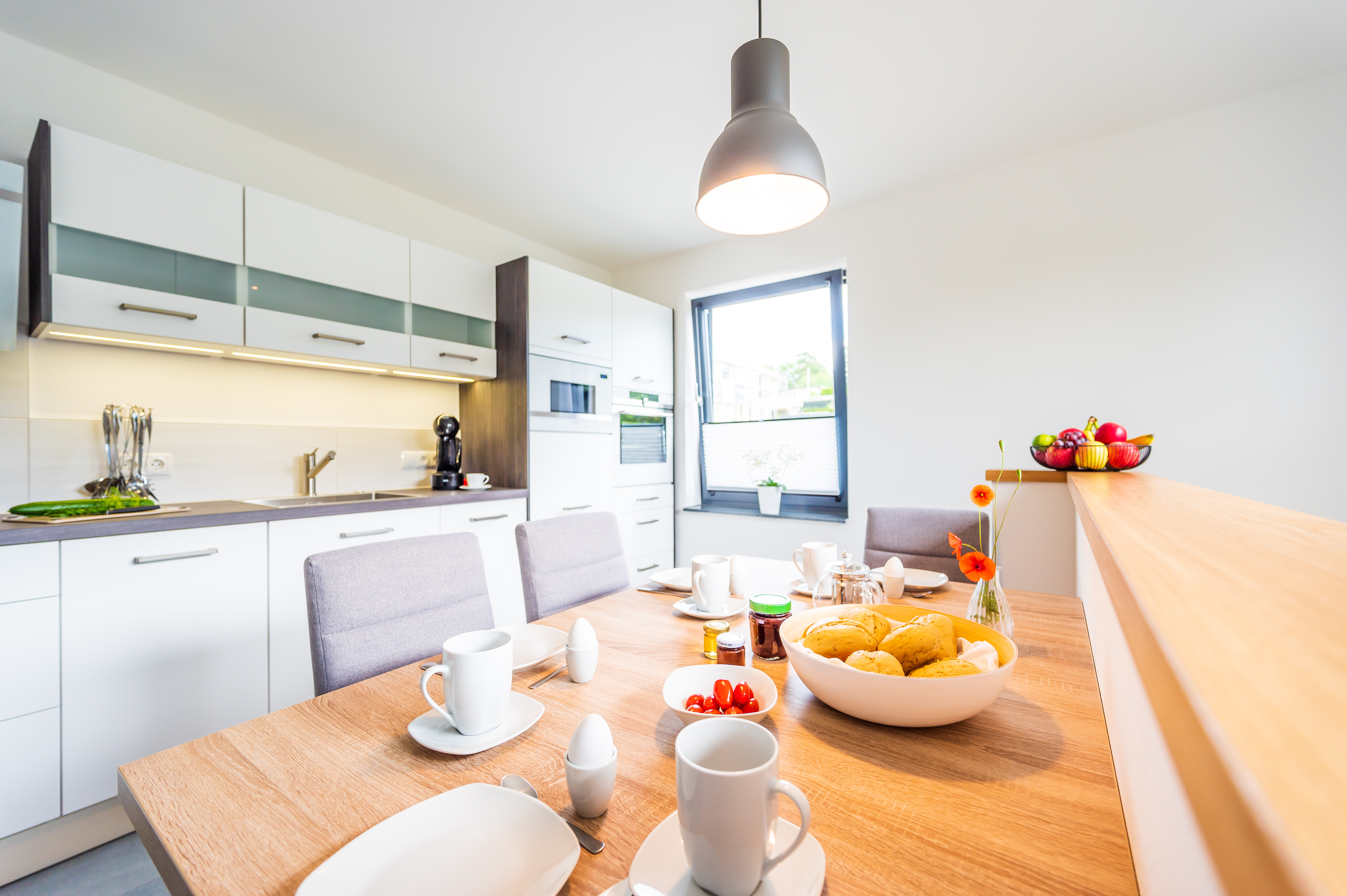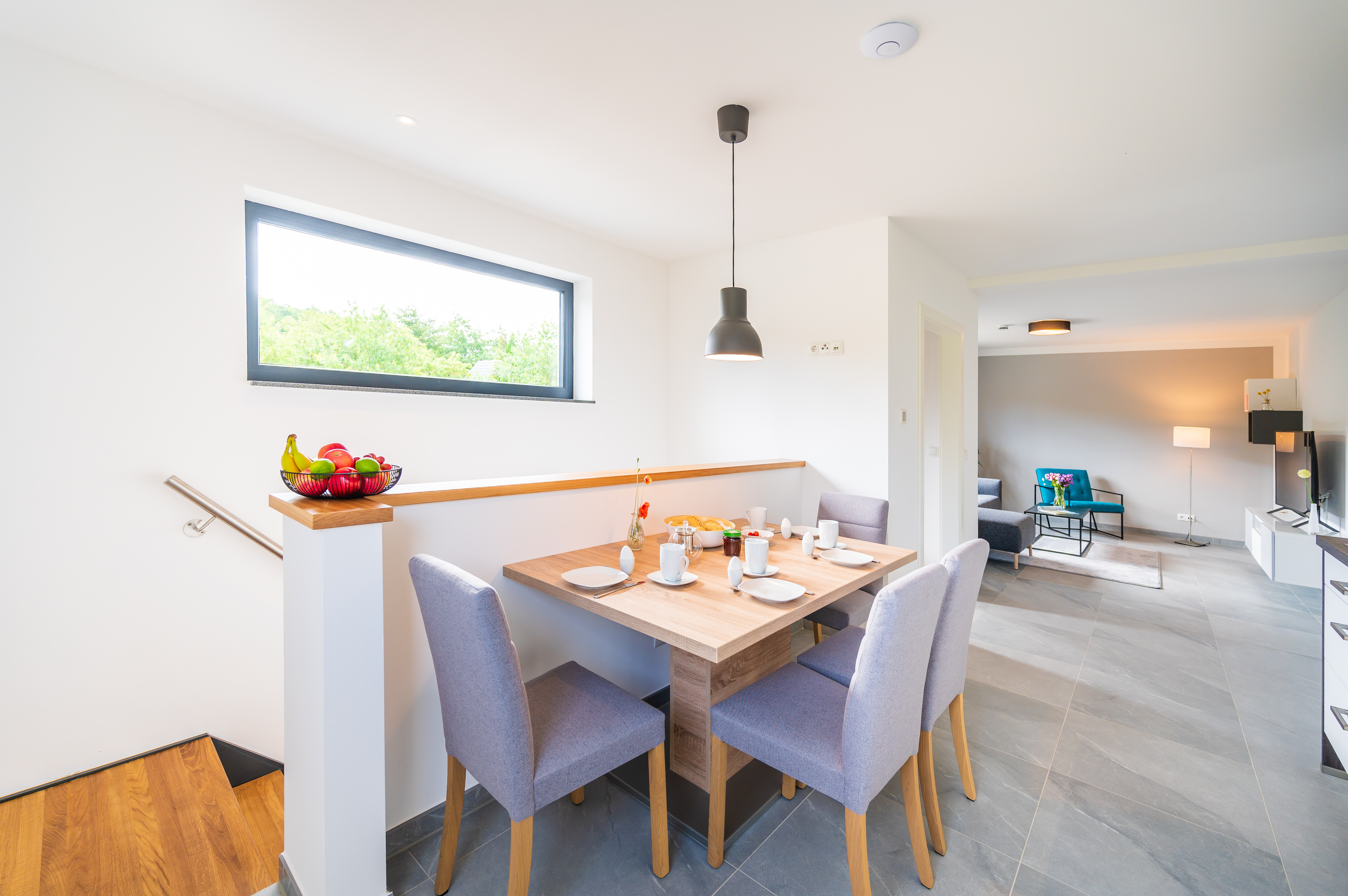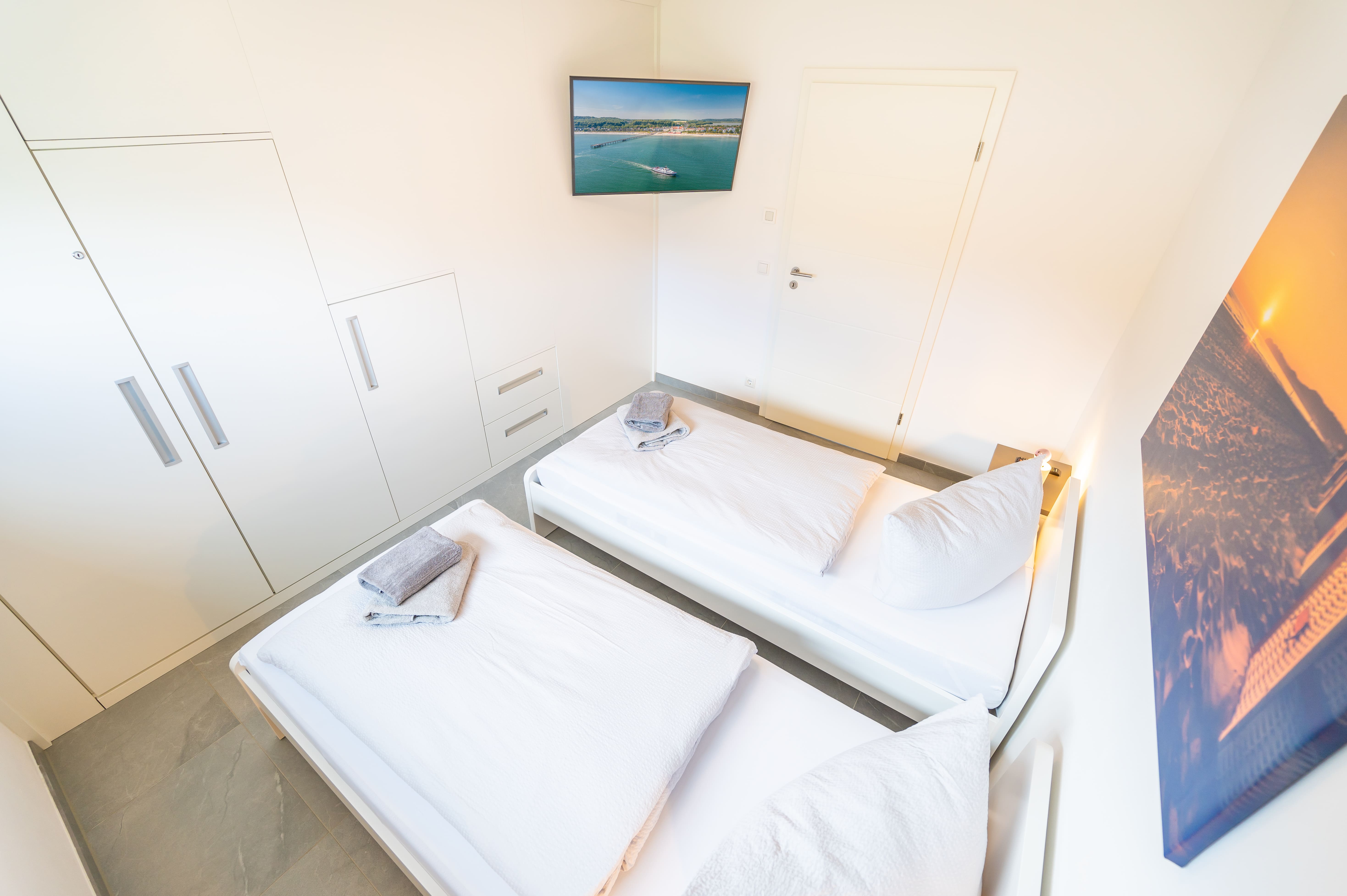 Die Wohnung erstreckt sich über zwei Etagen. In der oberen Etage ist der Wohnbereich mit offener Küche. Die Küche ist hochwertig ausgestattet mit Backofen, Induktionskochfeld, Mikrowelle, Geschirrspüler, Filterkaffeemaschine, Nespresso Kapselmaschine, Toaster und Wasserkocher. Im Erdgeschoss befinden sich die beiden Schlafzimmer (jeweils mit TV) sowie das Badezimmer mit Dusche. Vom großen Schlafzimmer gibt es einen Zugang zur Terrasse.